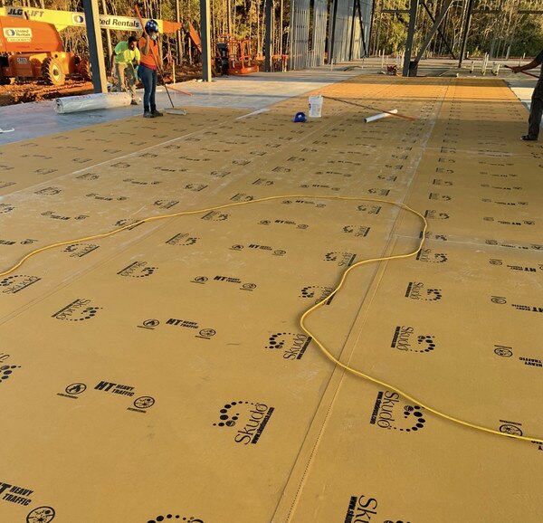 Skudo HT (Heavy Traffic) Commercial System is a fully adhered, breathable, temporary surface protection system for commercial projects. It consists of a flexible, peelable Concrete Base Coat and Skudo HT (Heavy Traffic) Mat. The HT Commercial System is Skudo's most durable protection, withstanding machinery, shoring and tough environments. It is perfectly suited for protecting concrete, allowing full cure without creating hydration (cure) lines.